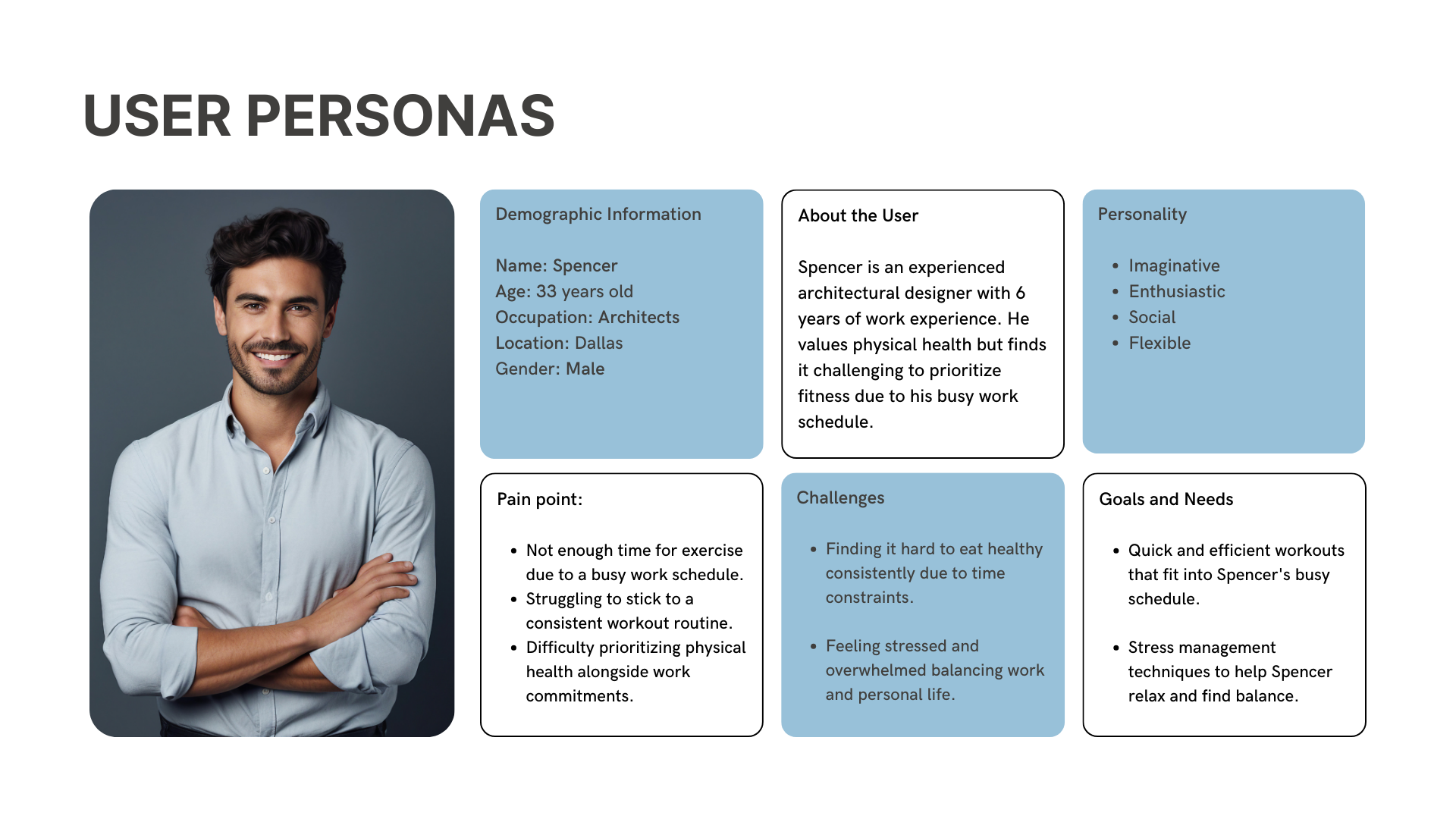 Summarizing and analyzing the survey questionnaire data, I crafted user personas based on insights gathered, streamlining my understanding of key frustrations highlighted in user interviews: time constraints for regular exercise and lack of motivation.